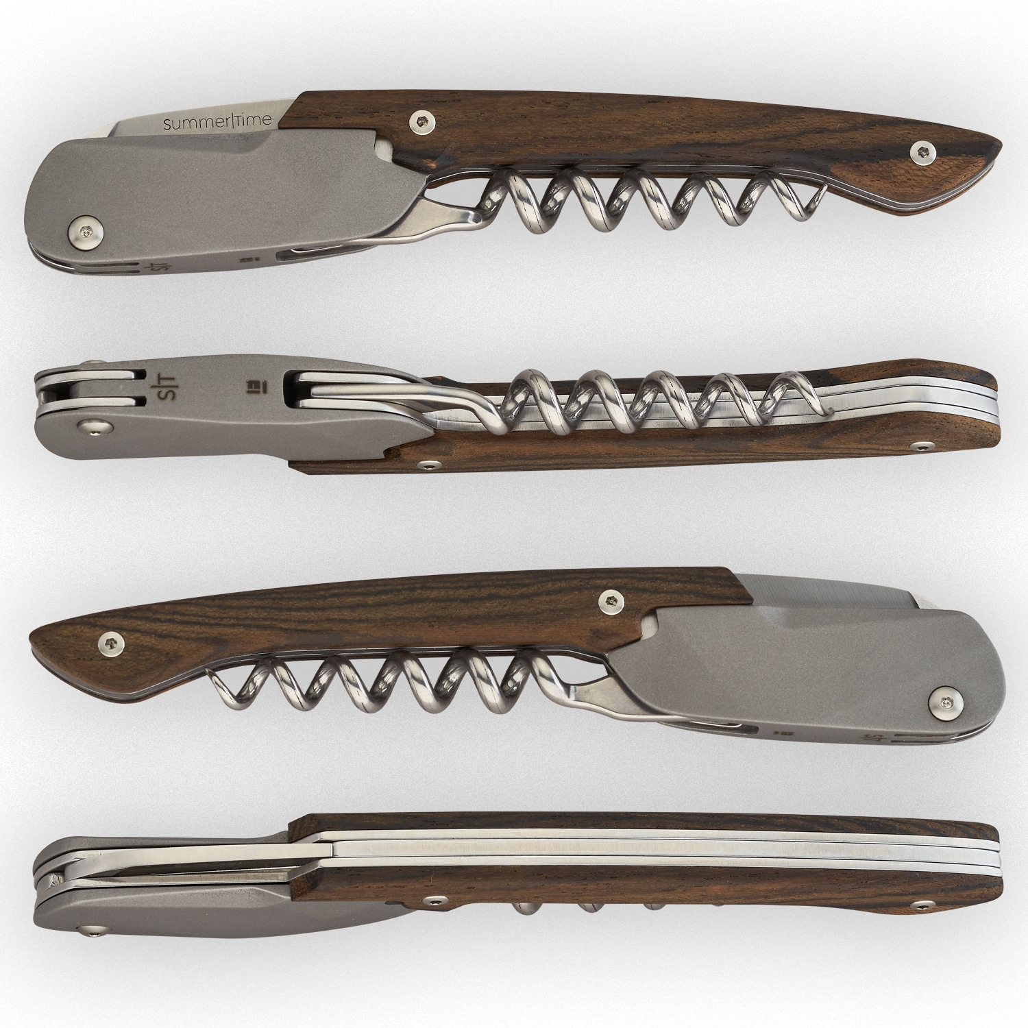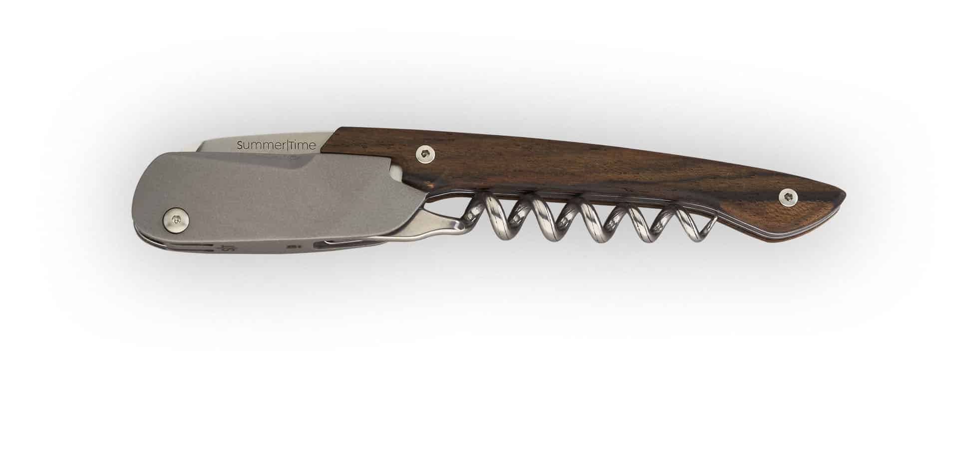Sommelier SummerTime Miles, finition acier inoxydable sablé huilé et bois ziricote. Tenue en main exceptionnelle, effet de levier parfait, mèche tire-bouchon conique 5 spires. Objet cadeau à offrir – et  à s’offrir – Miles joue l’harmonie parfaite de ses beaux reflets gris, acier, marron-noir.
